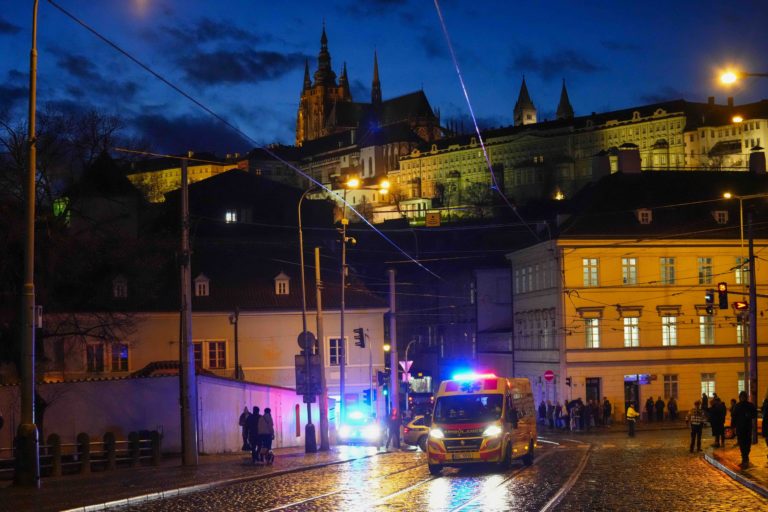 Sanitka smeruje k budove Filozofickej fakulty Karlovej univerzity v Prahe, kde došlo k streľbe s niekoľkými mŕtvymi a zranenými. Praha, 21. december 2023. Foto: SITA/AP