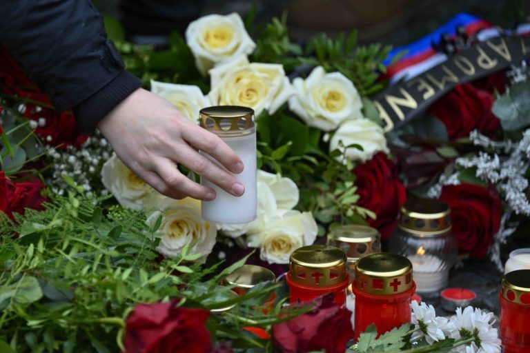 Kvetiny a sviečky pre obete streľby na Karlovej univerzite v Prahe, 22. decembra 2023. Foto: SITA/AP