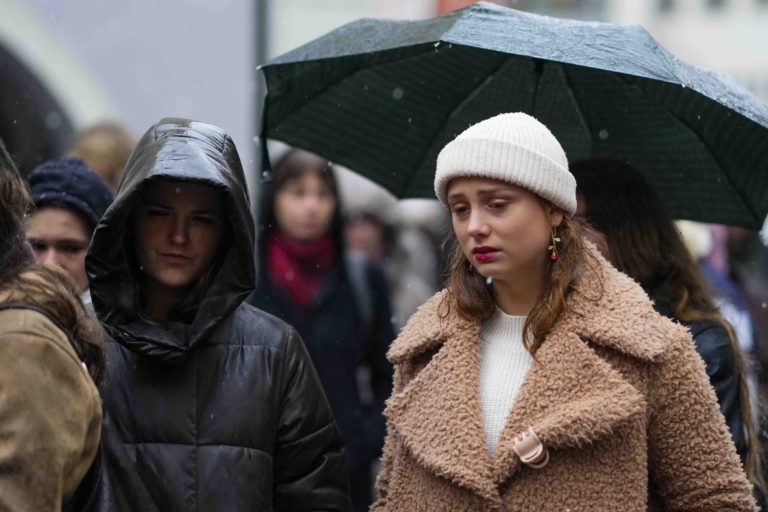 Ľudia čakajú neďaleko budovy Filozofickej fakulty Karlovej univrezity v Prahe, kde došlo k streľbe, ktorá si vyžiadala niekoľko mŕtvych a zranených. Praha, 21. december 2023. Foto: SITA/AP