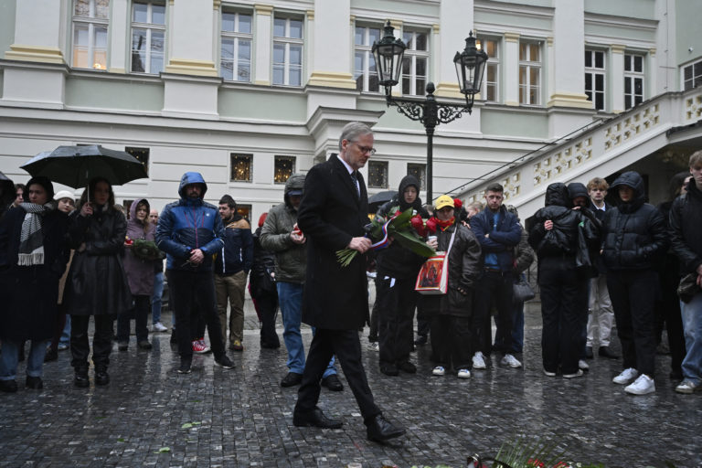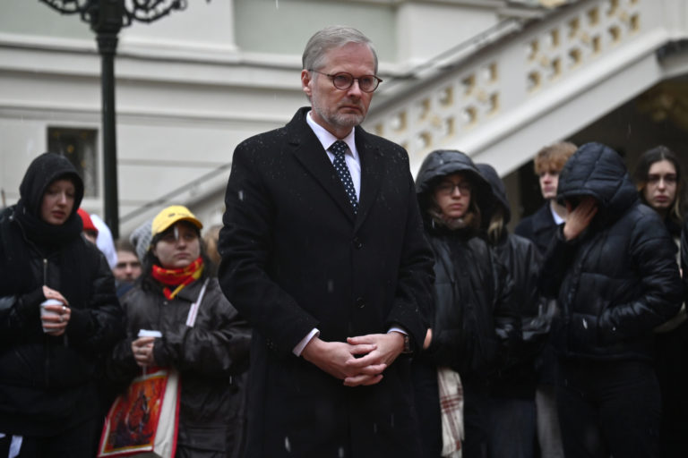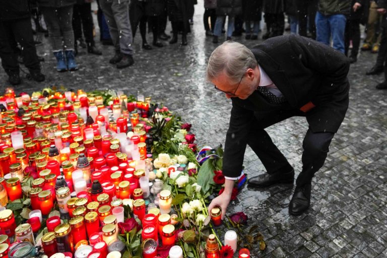 Český premiér Petr Fiala zapaľuje sviečku obetiam streľby na Karlovej univerzite v Prahe, 22. decembra 2023. Foto: SITA/AP
