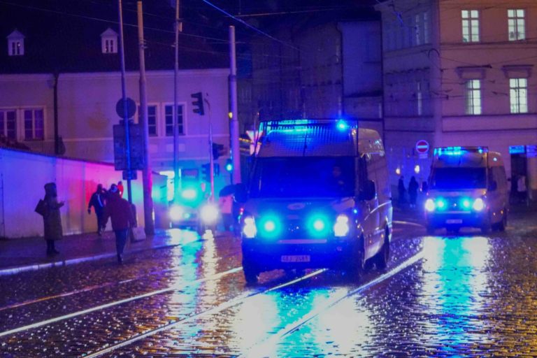 Policajné autá smerujú k budove Filozofickej fakulty Karlovej univerzity v Prahe, kde došlo k streľbe s niekoľkými mŕtvymi a zranenými. Praha, 21. december 2023. Foto: SITA/AP