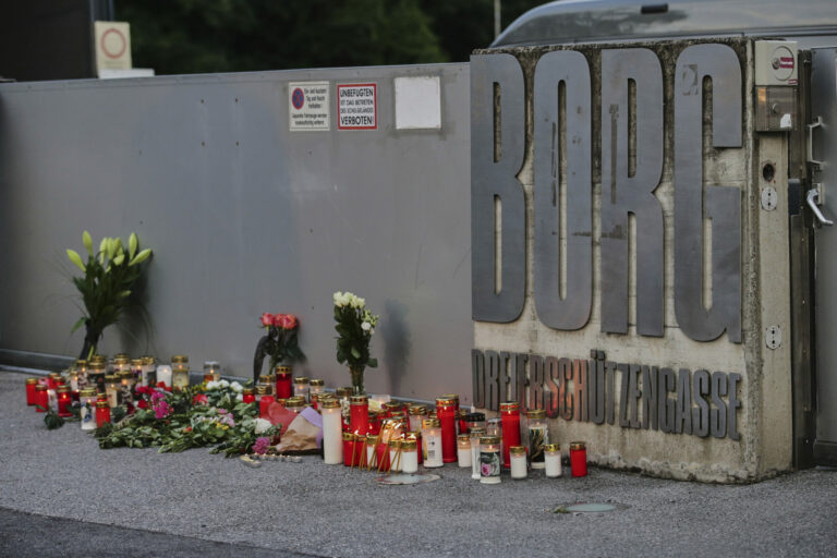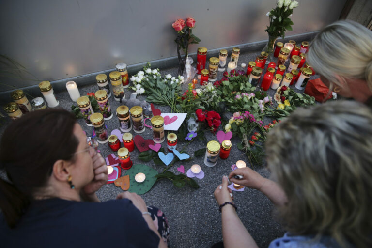 Pred vchodom do školy v Grazi vzniklo pietne miesto, kde ľudia nosia kvety a zapaľujú sviečky. Graz, 10. júna 2025 Foto: SITA/AP.