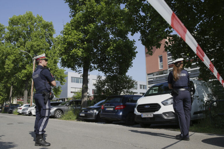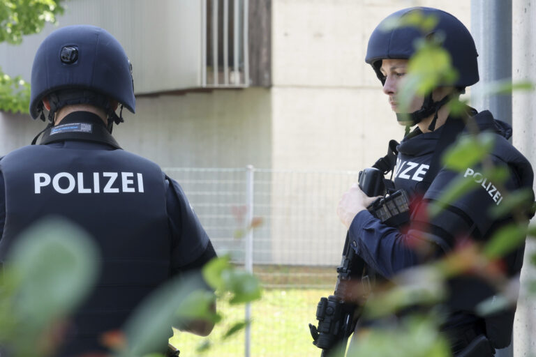 Policajti na mieste streľby v škole v rakúskom Grazi v utorok 10. júna 2025. Foto: Kleine Zeitung via AP