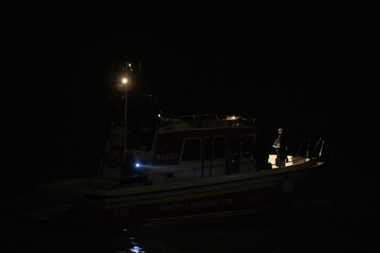Polícia na lodi na hladine Dunaja v Bratislave pátra po páchateľovi, ktorý uniká po streľbe na Zámockej ulici. Bratislava, 12. október 2022. Foto: SITA/Diana Černáková.