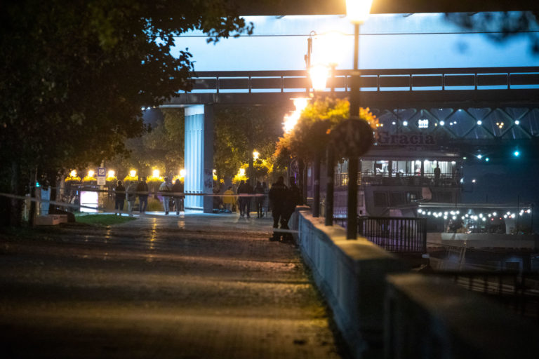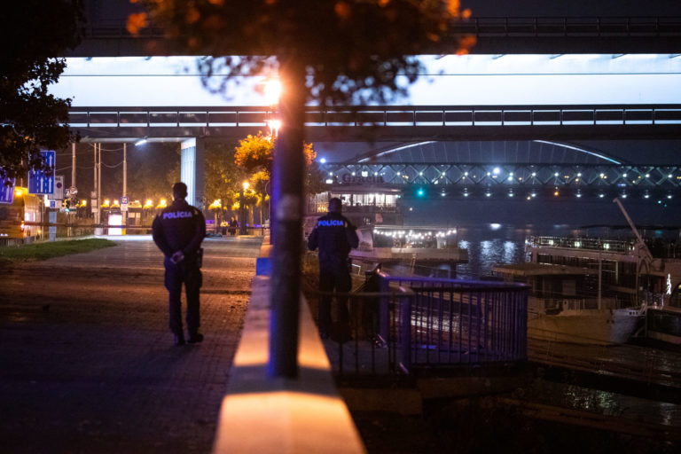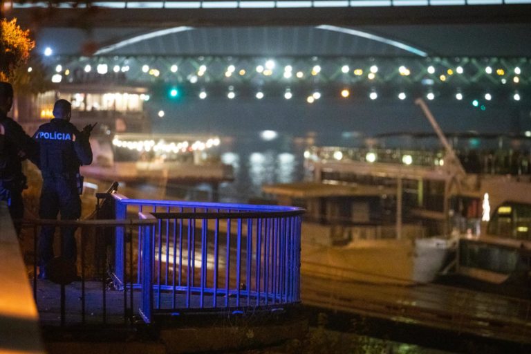 Polícia pátra po páchateľovi na úteku na nábreží Dunaja v Bratislave po streľbe, ktorá sa udiala v stredu krátko po 19:00 na Zámockej ulici. Bratislava, 12. október 2022. Foto: SITA/Diana Černáková.