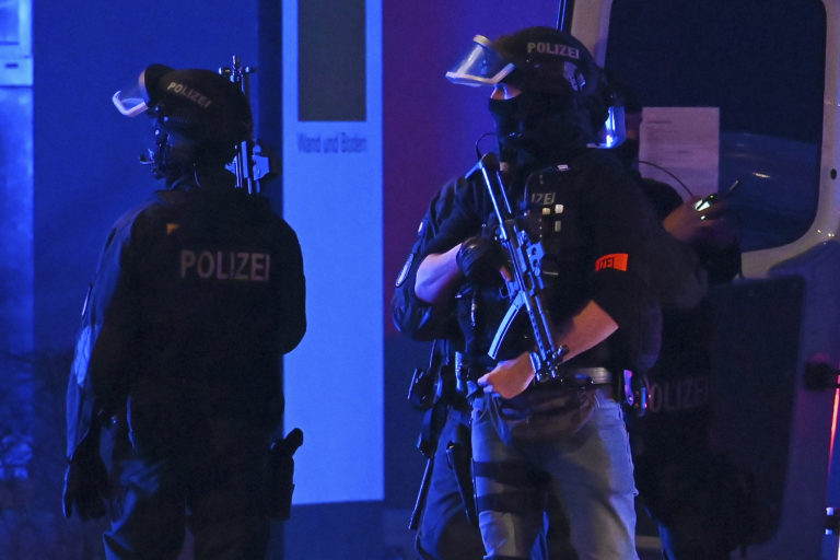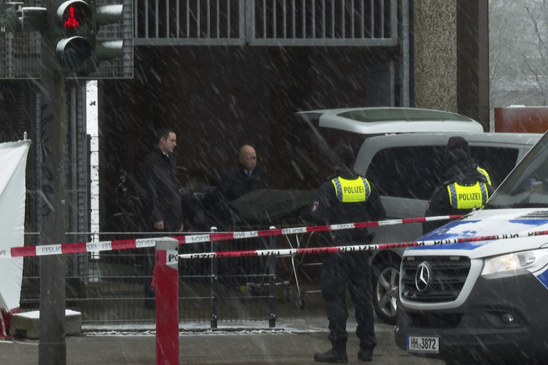 Ozbrojení policajti neďaleko miesta streľby v nemeckom Hamburgu vo štvrtok 9. marca 2023 po tom, čo jeden alebo viacerí ľudia spustili paľbu v budove Svedkov Jehovových. Foto: SITA/AP