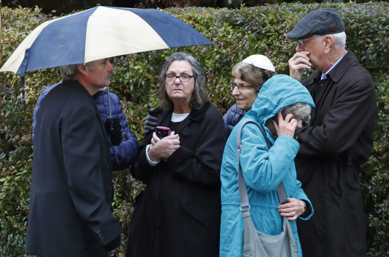 Ľudia sa zhromažďovali na rohu v blízkosti synagógy Tree of Life v Pittsburghu, kde došlo k streľbe, 27 október 2018. Foto: SITA/AP