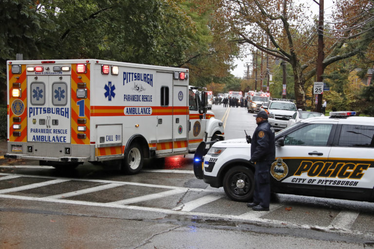Príchod sanitky ku synagóge Tree of Life v Pittsburghu, kde došlo k streľbe, 27. októbra 2018. Foto: SITA/AP