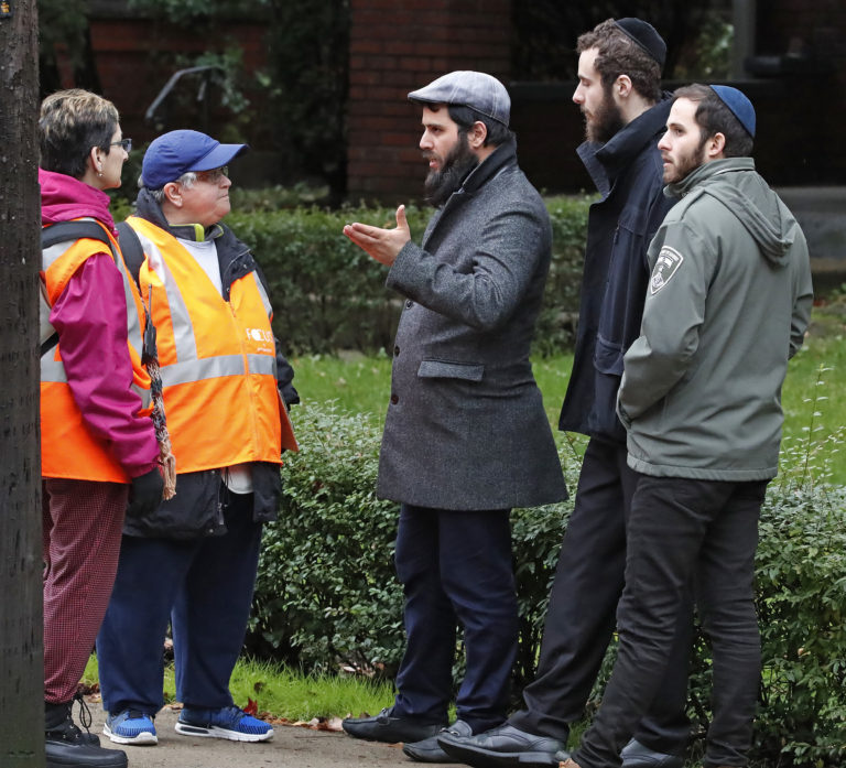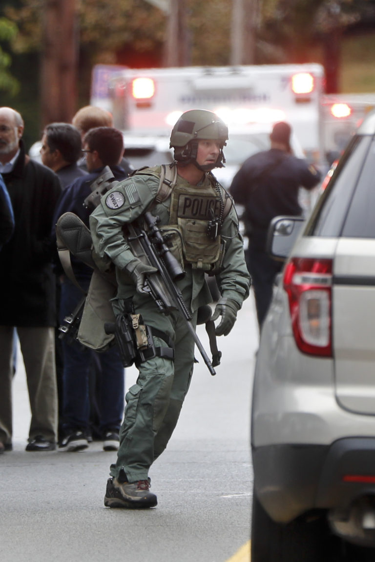 Ozbrojení dôstojníci chodia po ulici v okrese Squirrel Hill v Pittsburghu, kde strelec začal strieľať počas bohoslužieb v synagóge kongregácie Tree of Life, 27. októbra 2018. Foto: SITA/AP