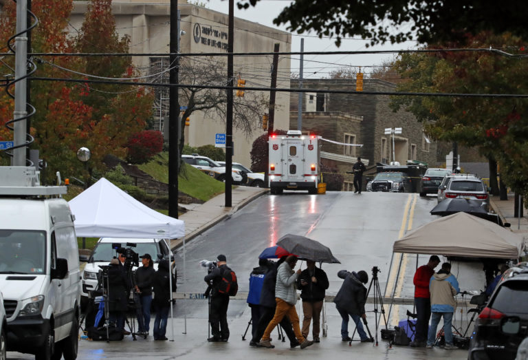 Mediálne stany a vozidlá križujú križovatku pri synagóge Tree of Life, kde došlo k streľbe, 27. októbra 2018. Foto: SITA/AP