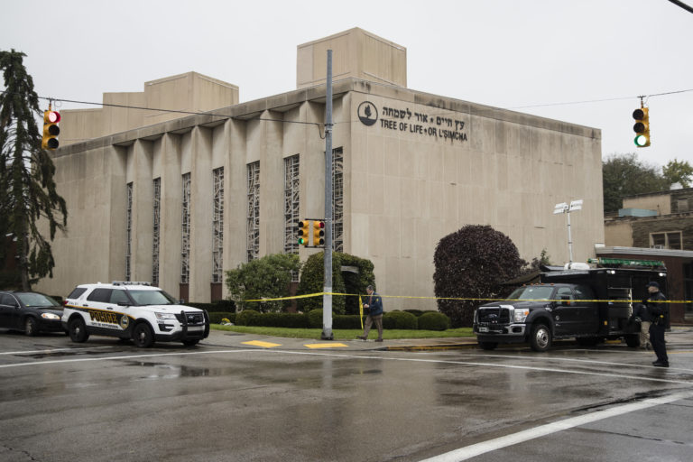 Polícia stráži synagógu Tree of Life v Pittsburghu, kde došlo k streľbe, 27. októbra 2018. Foto: SITA/AP
