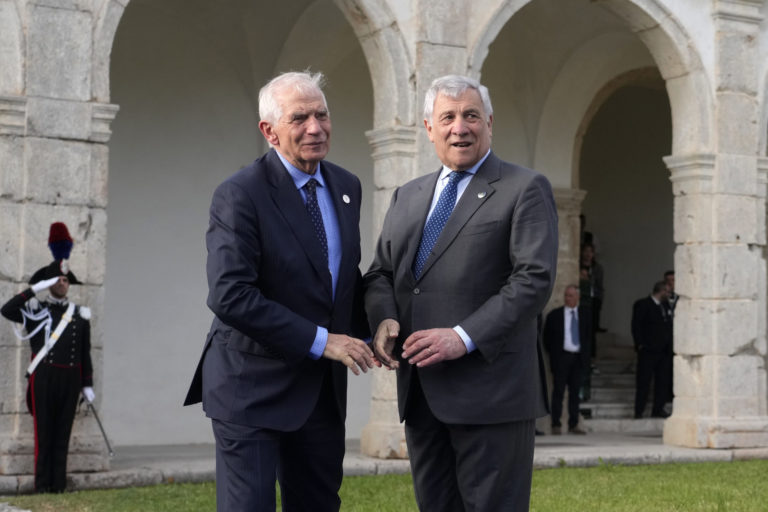 Taliansky minister zahraničných vecí Antonio Tajani (vpravo) víta šéfa zahraničnej politiky Európskej únie Josepa Borrella na stretnutí ministrov zahraničných vecí G7 na talianskom ostrove Capri v stredu 17. apríla 2024. Foto: SITA/AP