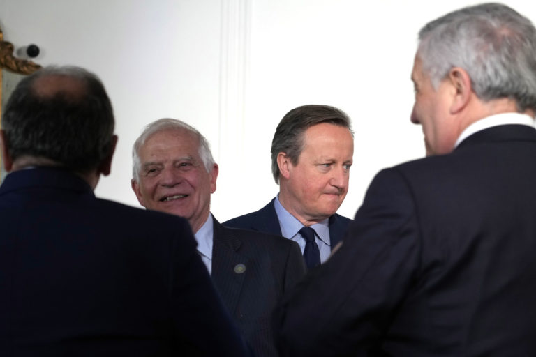 Šéf zahraničnej politiky Európskej únie Josep Borrell (vľavo) a britský minister zahraničných vecí David Cameron prichádzajú na rodinnú fotografiu počas stretnutia ministrov zahraničných vecí krajín G7 na talianskom ostrove Capri vo štvrtok 18. apríla 2024. Foto: SITA/AP