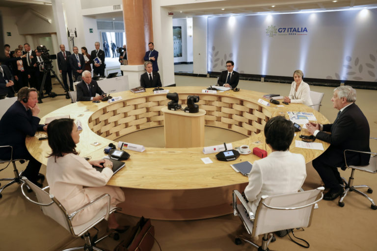 Britský minister zahraničných vecí David Cameron (vľavo), šéf zahraničnej politiky Európskej únie Josep Borrell (hore vľavo), americký minister zahraničných vecí Antony Blinken (hore druhý zľava), nemecká ministerka zahraničných vecí Annalena Baerbocková (dole vľavo), japonská ministerka zahraničných vecí Yoko Kamikawa (dole vpravo), kanadská ministerka zahraničných vecí Melanie Jolyová (hore vpravo), francúzsky minister zahraničných vecí Stephane Sejourne a taliansky minister zahraničných vecí Antonio Tajani (vpravo) sa stretávajú počas druhého dňa stretnutia ministrov zahraničných vecí skupiny G7 na talianskom ostrove Capri vo štvrtok 18. apríla 2024. Foto: Remo Casilli/Pool via AP