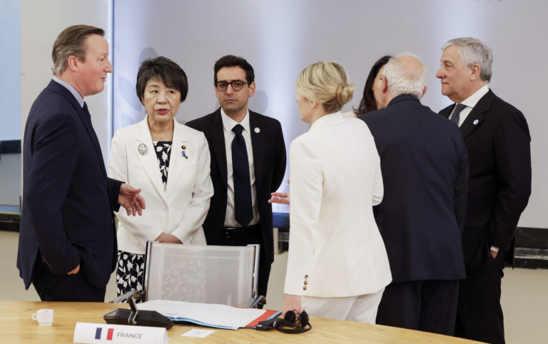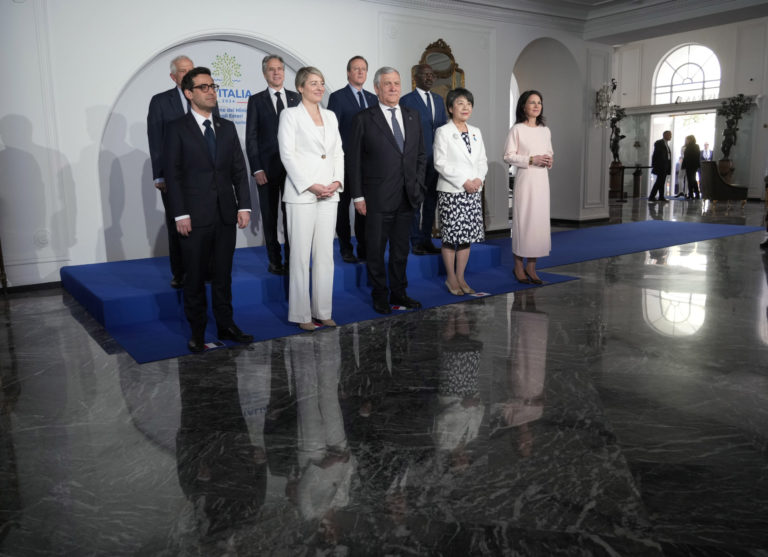 V prvom rade zľava: Francúzsky minister zahraničných vecí Stephane Sejourne, kanadská ministerka zahraničných vecí Melanie Joly , taliansky minister zahraničných vecí Antonio Tajani, japonská ministerka zahraničných vecí Yoko Kamikawa, nemecká ministerka zahraničných vecí Annalena Baerbock; v zadnom rade zľava: Šéf zahraničnej politiky Európskej únie Josep Borrell, minister zahraničných vecí USA Antony Blinken, britský minister zahraničných vecí David Cameron a minister zahraničných vecí Mauritánie Mohamed Salem Ould Merzoug pózujú počas rodinnej fotografie počas stretnutia ministrov zahraničných vecí krajín G7 na talianskom ostrove Capri vo štvrtok 18. apríla 2024. Foto: SITA/AP