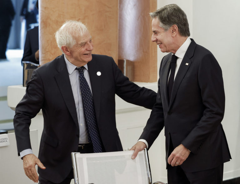 Šéf zahraničnej politiky Európskej únie Josep Borrell a minister zahraničných vecí USA Antony Blinken (vpravo) sa zúčastňujú na stretnutí počas druhého dňa zasadnutia ministrov zahraničných vecí krajín G7 na talianskom ostrove Capri vo štvrtok 18. apríla 2024. Foto: Remo Casilli/Pool via AP