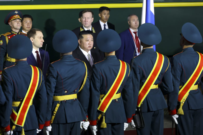Uvítacia ceremónia na počesť severokórejského vodcu Kim Čong-una na železničnej stanici v Khasane, ktorý leží asi 127 km od Vladivostoku v Rusku. Foto: SITA/Press Office of the Primorsky Krai region administration via AP