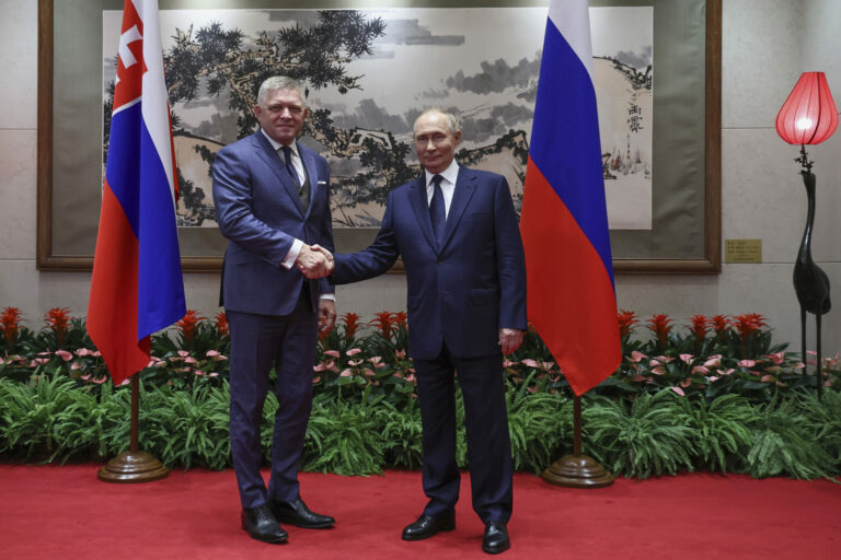 Premiér SR Robert Fico sa stretol s ruským prezidentom Vladimirom Putinom v štátnej rezidencii Diaoyutai v Pekingu v Číne, utorok 2. septembra 2025. Foto: Vladimir Smirnov, Sputnik, Kremlin Pool Photo via AP