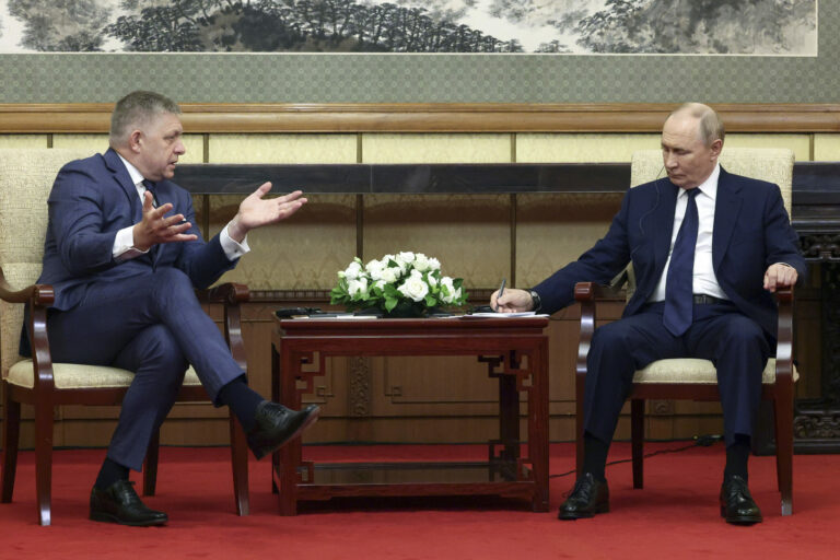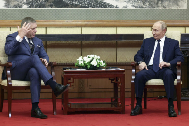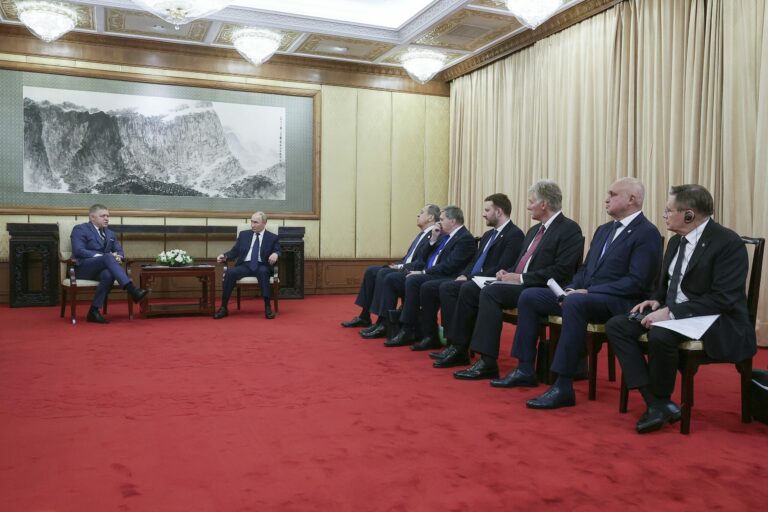 Ruský prezident Vladimir Putin počas stretnutia so slovenským premiérom Robertom Ficom v štátnej rezidencii Diaoyutai v Pekingu v Číne, utorok 2. septembra 2025. Foto: Vladimir Smirnov, Sputnik, Kremlin Pool Photo via AP