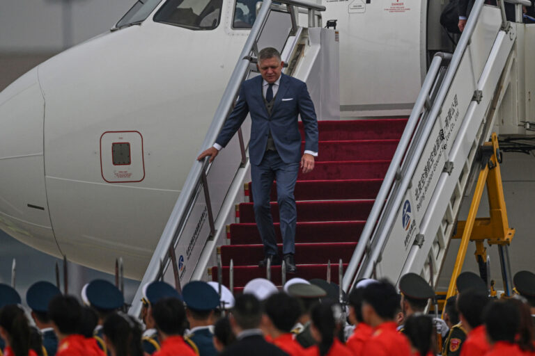 Slovenský premiér Robert Fico prichádza na medzinárodné letisko v Pekingu pred vojenskou prehliadkou pri príležitosti 80. výročia víťazstva nad Japonskom a konca druhej svetovej vojny v Pekingu v utorok 2. septembra 2025. Foto: Jade Gao/Pool Photo via AP