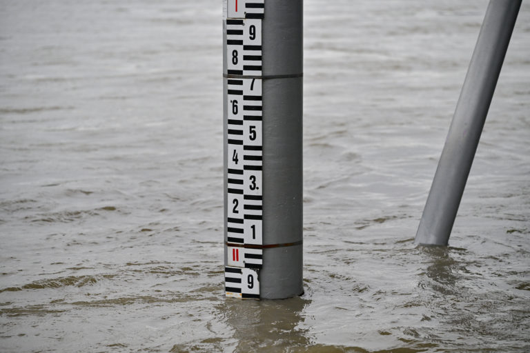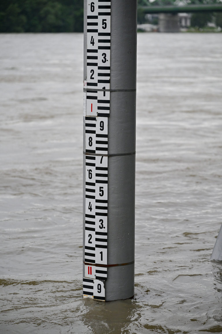 Hladinomer počas stúpania hladiny rieky Dunaj na Nábreží Eurovea v Bratislave. Bratislava, 4. jún 2024. Foto: SITA.