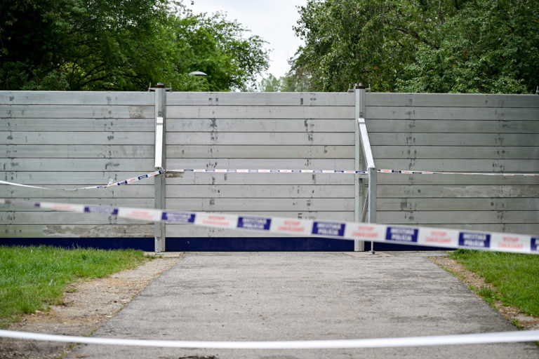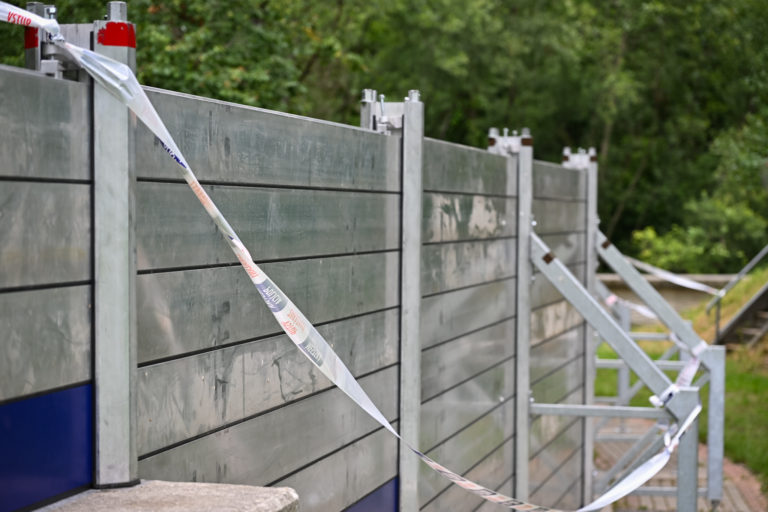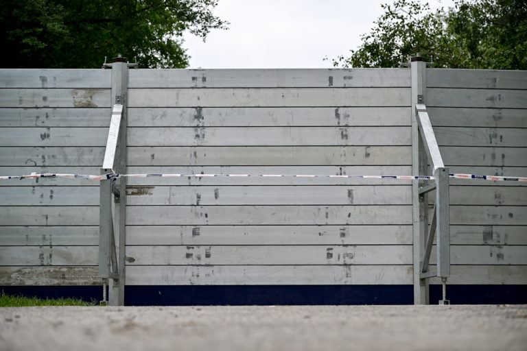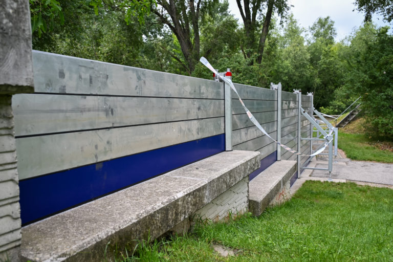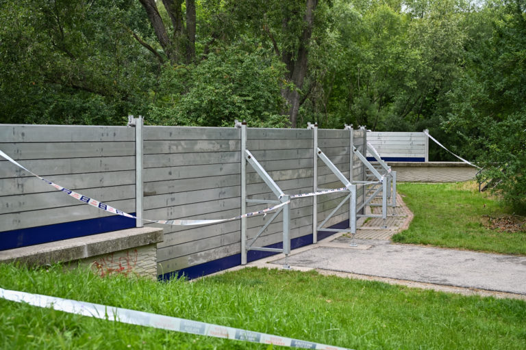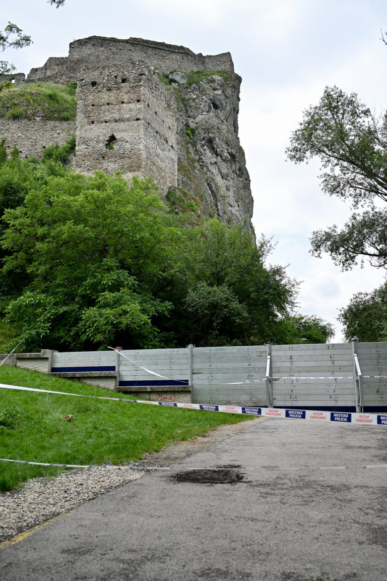 Protipovodňové bariéry pri hrade Devín z dôvodu prudkého stúpania hladiny rieky Dunaj. Bratislava, 4. jún 2024. Foto: SITA