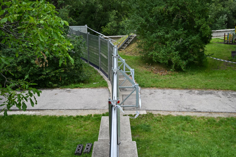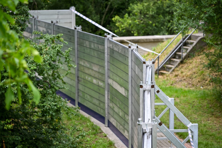 Protipovodňové bariéry pri hrade Devín osadené z dôvodu prudkého stúpania hladiny rieky Dunaj. Bratislava, 4. jún 2024. Foto: SITA