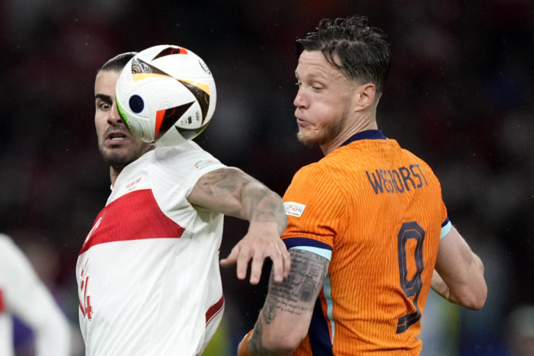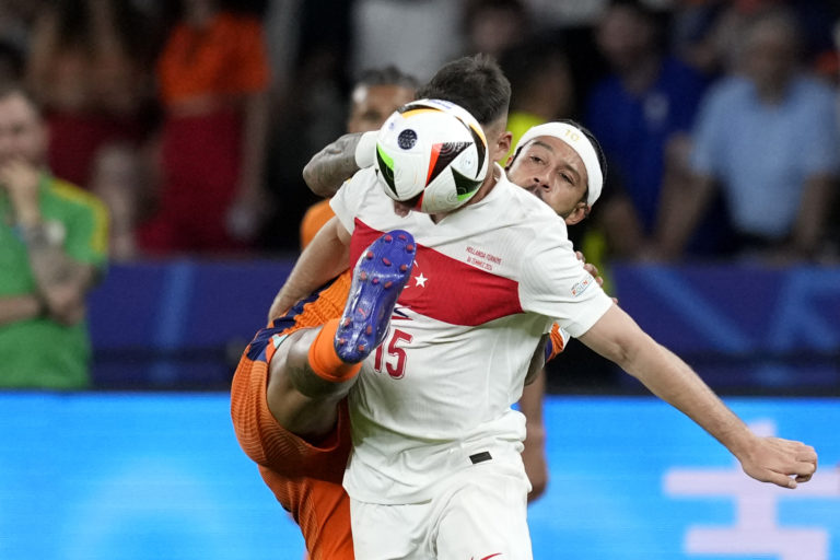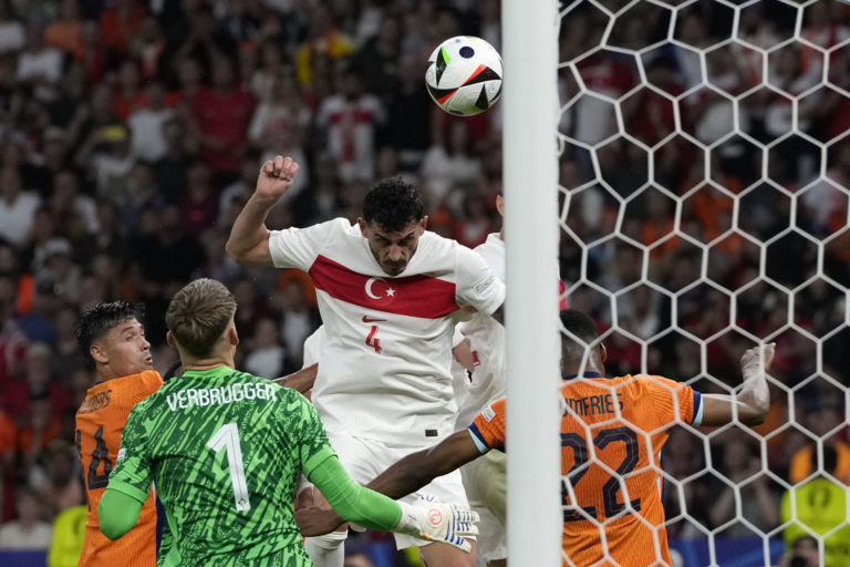 Samet Akaydin z Turecka (v strede) strieľa hlavou gól Holandsku počas štvrťfinálového zápasu na ME vo futbale 2024. Berlín, 6. júl 2024. Foto: SITA/AP