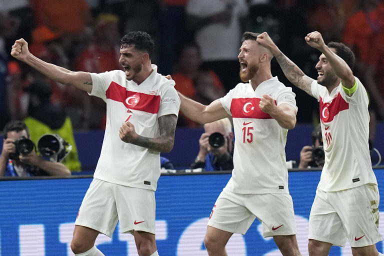 Samet Akaydin z Turecka (vpravo) sa raduje zo svojho gólu v sieti Holandska počas štvrťfinálového zápasu na ME vo futbale 2024. Berlín, 6. júl 2024. Foto: Spada/LaPresse via AP