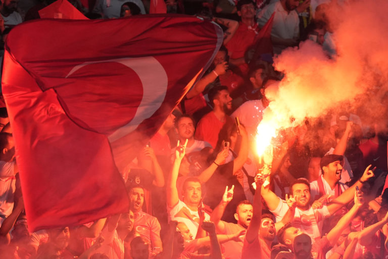 Radosť a gestá fanúšikov Turecka po góle v sieti Holandska počas štvrťfinálového zápasu na ME vo futbale 2024. Berlín, 6. júl 2024. Foto: SITA/AP