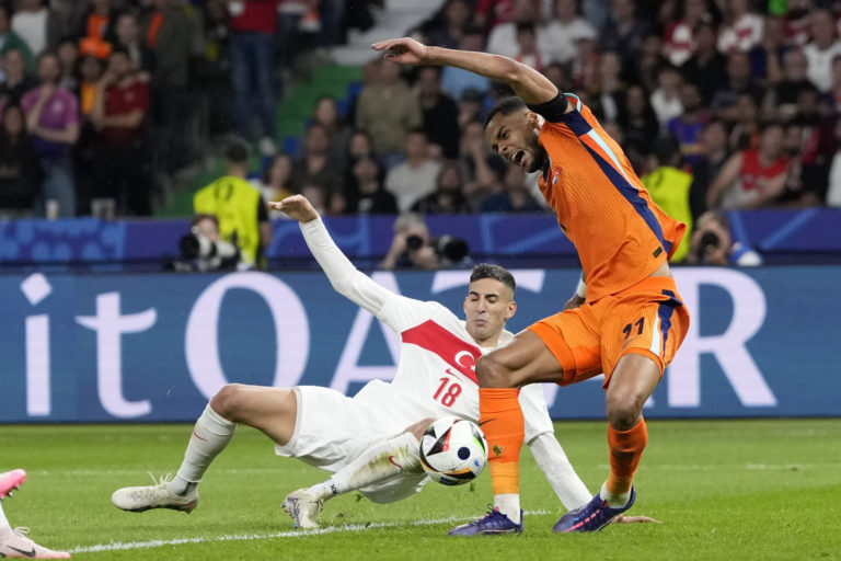 Samet Akaydin z Turecka (vľavo) sa snaží odkopnúť loptu atakovaný Codym Gakpom z Holandska počas štvrťfinálového zápasu na ME vo futbale 2024. Berlín, 6. júl 2024. Foto: SITA/AP