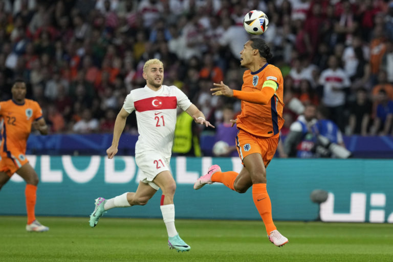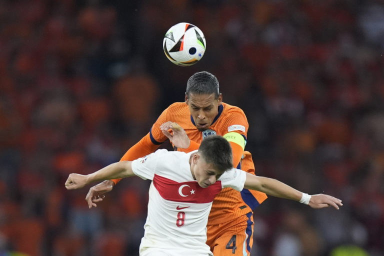 Virgil van Dijk z Holandska (vpravo) hlavičkuje loptu pred Barisom Alperom Yilmazom z Turecka počas štvrťfinálového zápasu na ME vo futbale 2024. Berlín, 6. júl 2024. Foto: SITA/AP