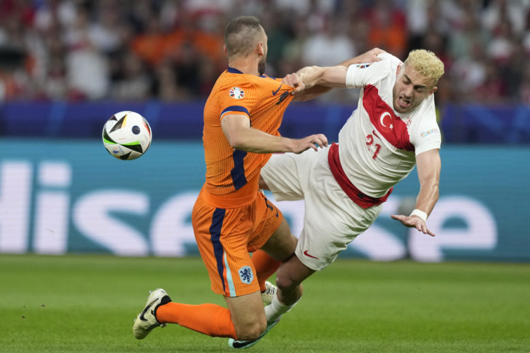 Stefan de Vrij z Holandska (vľavo) v súboji s Barisom Alperom Yilmazom z Turecka počas štvrťfinálového zápasu na ME vo futbale 2024. Berlín, 6. júl 2024. Foto: SITA/AP