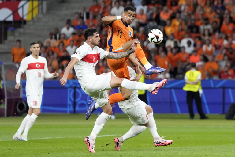 Memphis Depay z Holandska (vzadu) sa snaží odkopnúť loptu pred Salihom Özcanom z Turecka počas štvrťfinálového zápasu na ME vo futbale 2024. Berlín, 6. júl 2024. Foto: SITA/AP