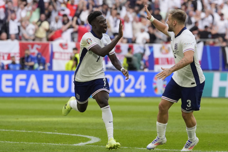 Anglický futbalista Bukayo Saka (vľavo) prijíma gratuláciu po strelenom góle od svojho spoluhráča Luka Shawa počas štvrťfinálového zápasu na ME vo futbale 2024. Düsseldorf, 6. júl 2024. Foto: archívne, SITA/AP.