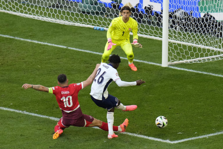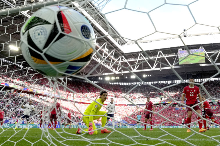 Švajčiarsky brnakár Yann Sommer (uprostred) sa pozerá na loptu v bráne, ktorú vystrelil anglický futbalista Bukayo Saka počas štvrťfinálového zápasu na ME vo futbale 2024. Düsseldorf, 6. júl 2024. Foto: SITA/AP.
