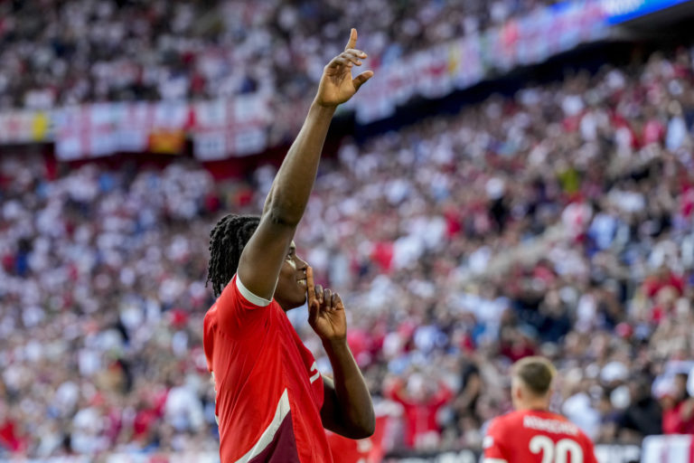 Švajčiarsky futbalista Breel Embolo oslavuje gól do anglickej brány počas štvrťfinálového zápasu na ME vo futbale 2024. Düsseldorf, 6. júl 2024. Foto: SITA/AP.