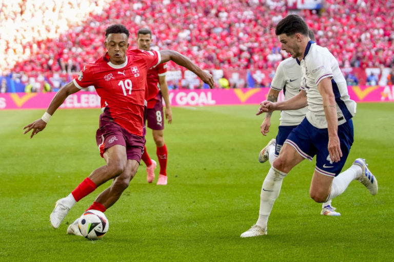 Švajčiarsky futbalista Dan Ndoye (vľavo) sa snaží uniknúť s loptou pred anglickým hráčom Declanom Riceom počas štvrťfinálového zápasu na ME vo futbale 2024. Düsseldorf, 6. júl 2024. Foto: SITA/AP.