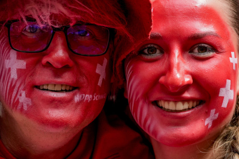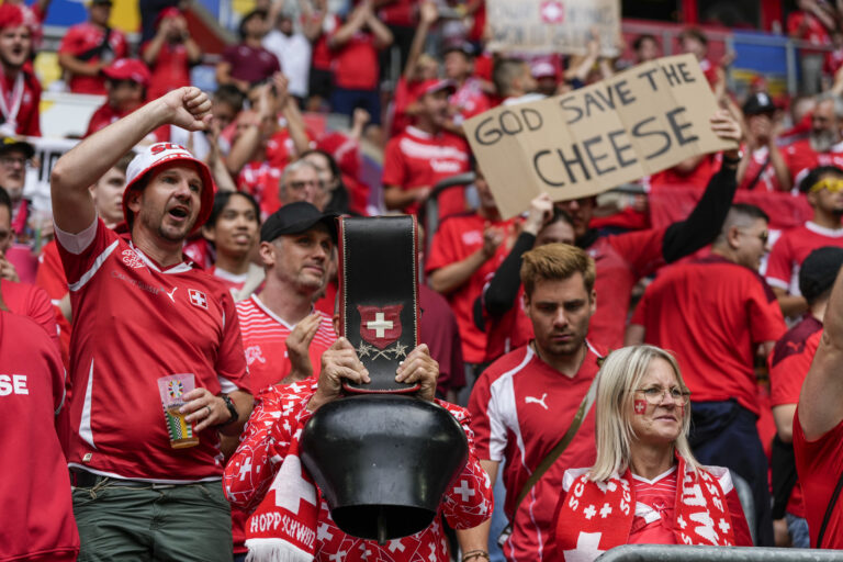 Švajčiarski fanúšikovia počas štvrťfinálového zápasu medzi Švajčiarskom a Anglickom na ME vo futbale 2024. Düsseldorf, 6. júl 2024. Foto: SITA/AP.