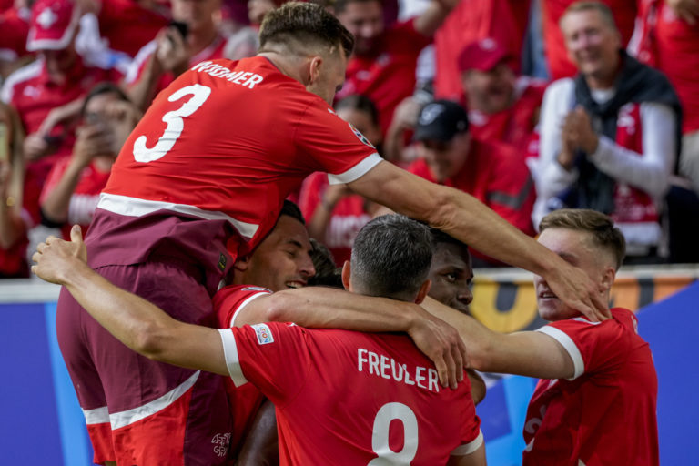 Švajčiarsky futbalista Breel Embolo oslavuje gól so svojimi spoluhráčmi počas štvrťfinálového zápasu na ME vo futbale 2024 proti Anglicku. Düsseldorf, 6. júl 2024. Foto: SITA/AP.