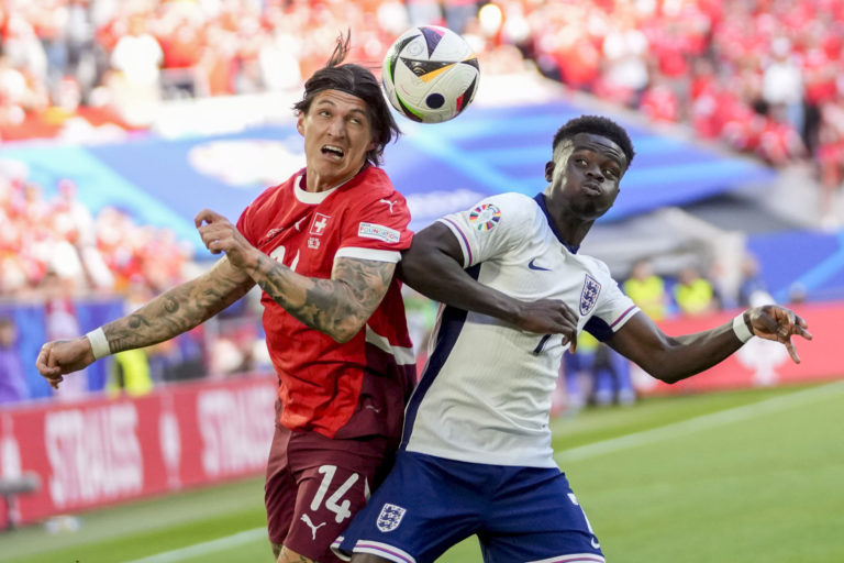 Švajčiarsky futbalista Steven Zuberleft v súboji o loptu s anglickým hráčom Bukayom Sakom počas štvrťfinálového zápasu na ME vo futbale 2024. Düsseldorf, 6. júl 2024. Foto: SITA/AP.