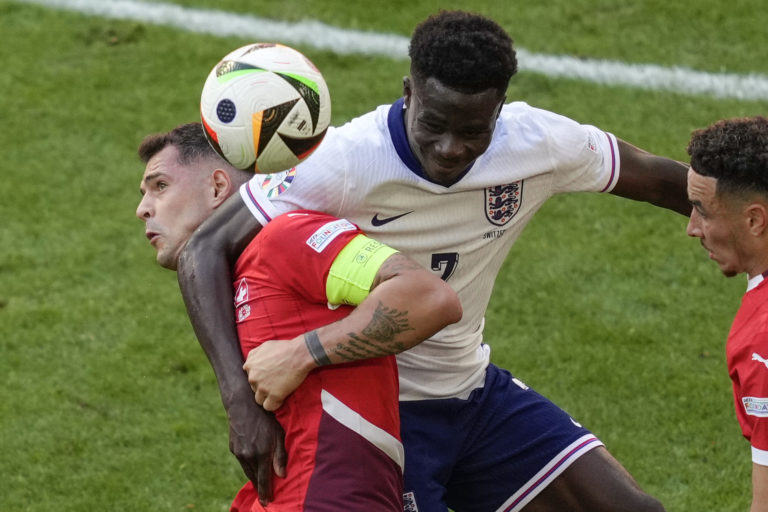 Anglický futbalista Bukayo Saka v súboji o loptu so švajčiarskym hráčom Granitom Xhakom počas štvrťfinálového zápasu na ME vo futbale 2024. Düsseldorf, 6. júl 2024. Düsseldorf, 6. júl 2024. Foto: SITA/AP.
