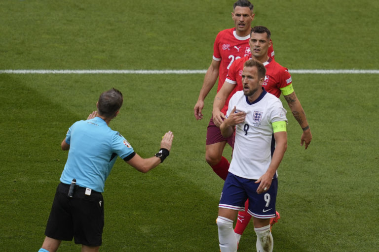 Anglický hráč Harry Kane hovorí s rozhodcom po tom, čo dostal žltú kartu počas štvrťfinálového zápasu medzi Švajčiarskom a Anglickom na ME vo futbale 2024. na ME vo futbale 2024. Düsseldorf, 6. júl 2024. Foto: SITA/AP.