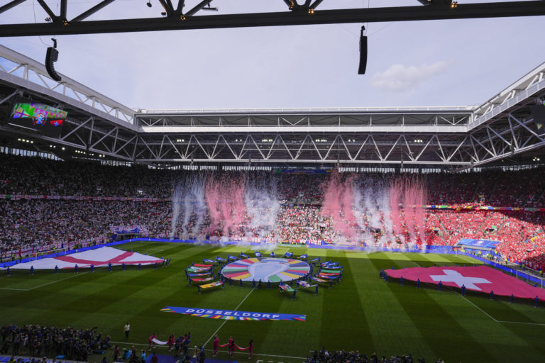 Pohľad na štadión v Düsseldorfe pred začiatkom štvrťfinálového zápasu Švajčiarska proti Anglicku na ME vo futbale 2024. Düsseldorf, 6. júl 2024. Foto: SITA/AP.