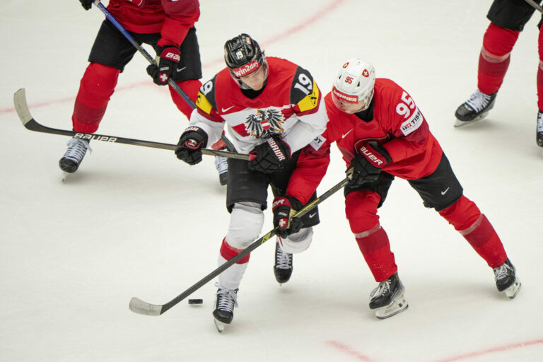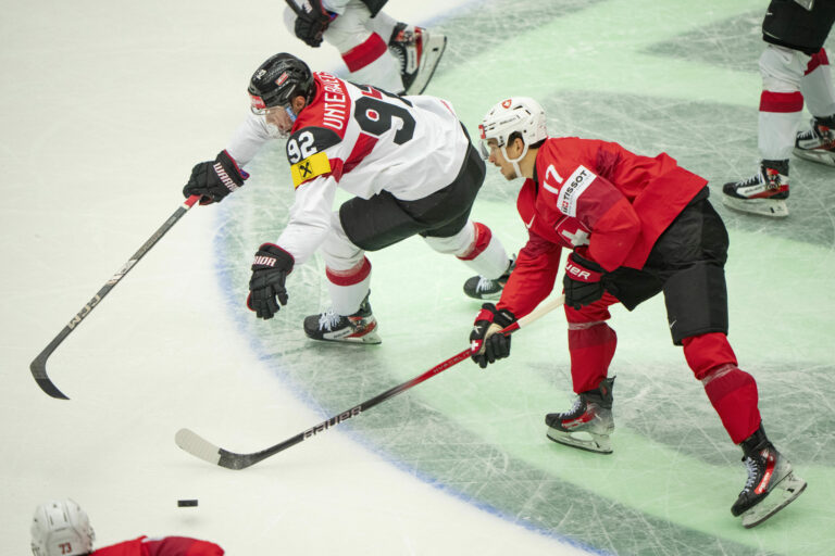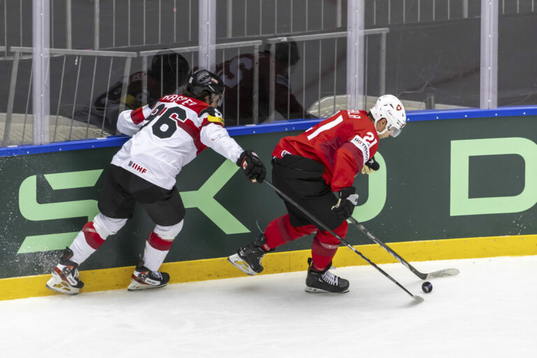 Rakúsky útočník Marco Kasper sa snaží obrať o puk Švajčiara Kevina Fialu počas štvrťfinálového zápasu na MS v hokeji 2025. Herning (Jyske Bank Boxen), 22. máj 2025. Foto: Salvatore Di Nolfi/Keystone via AP.