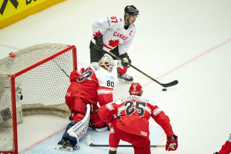 Kanadský kapitán Sidney Crosby v akcii v dánskom útočnom pásme počas štvrťfinálového zápasu na MS v hokeji 2025. Herning (Jyske Bank Boxen), 22. máj 2025. Foto: Bo Amstrup/Ritzau Scanpix via AP.