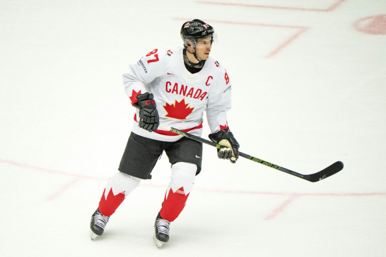 Kanadský kapitán Sidney Crosby počas zápasu proti Dánsku vo štvrťfinále MS v hokeji 2025. Herning (Jyske Bank Boxen), 22. máj 2025. Foto: Bo Amstrup/Ritzau Scanpix via AP.