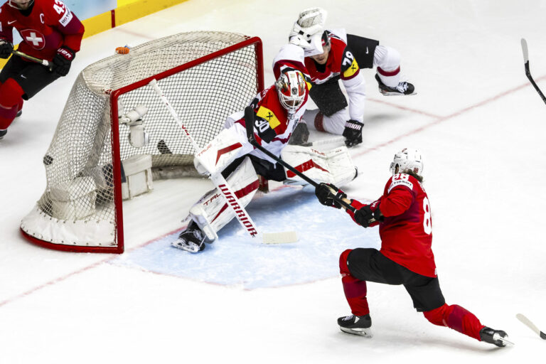 Švajčiarsky útočník Christoph Bertschy strieľa gól na 1:0 v zápase proti Rakúsku vo štvrťfinále MS v hokeji 2025. Herning (Jyske Bank Boxen), 22. máj 2025. Foto: Salvatore Di Nolfi/Keystone via AP.