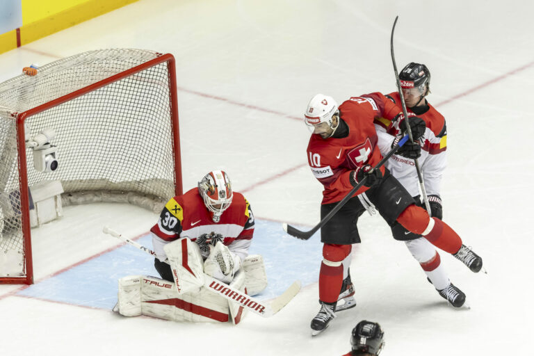 Zákrok rakúskeho brankára a pád Švajčiara Tima Meiera počas štvrťfinálového zápasu na MS v hokeji 2025. Herning (Jyske Bank Boxen), 22. máj 2025. Foto: Salvatore Di Nolfi/Keystone via AP.