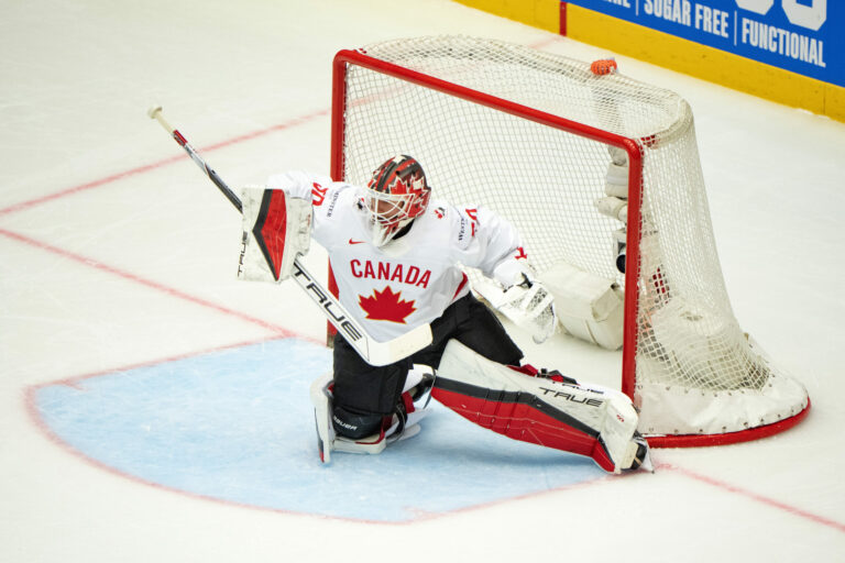 Zákrok kanadského brankára Jordana Binningtona v zápase proti Dánsku vo štvrťfinále MS v hokeji 2025. Herning (Jyske Bank Boxen), 22. máj 2025. Foto: Bo Amstrup/Ritzau Scanpix via AP.